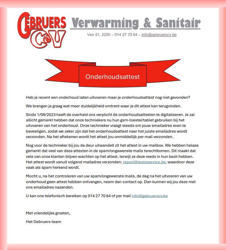 U kan ons steeds contacteren voor een vrijblijvende offerte. Dit kan steeds telefonisch (014 27 70 64) of per mail (info@gebruerscv.be). Wij staan voor u klaar om u zo snel als mogelijk van dienst te zijn.